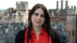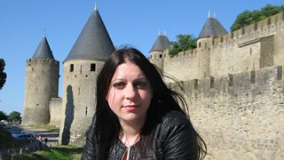 Dr Janina Ramirez at the walls of Carcassonne, southern France