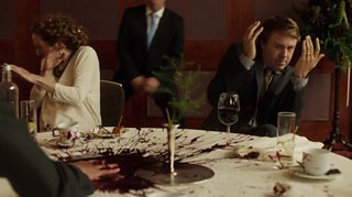 One of the effects I was asked to provide was for the scene where Ephra Stein (Andrew Buchan) and his wife Rachel Stein (Katherine Parkinson) are at a gala function and a protestor smashes a bag on the table covering them in fake blood.