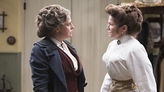 Helen (Rebecca Front) insists her dinner party napkins will do more to change the world than Margaret (Jessica Hynes) and her rousing suffragette speech