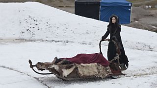Morganna (Katie McGrath) on her sleigh, with Gwaine (Eoin Macken)