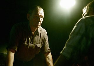 As Sean (Millson) flees the vengeful Bill Parry (Richards) he chances across three scarecrows, mistaking them in the dim light for help. Photo © Dogs Of Annwn Ltd.