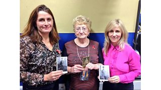 Cat Whiteaway, Anita Farrell holding replicas of Arthur Sheppard's medals and Eleri Sion.