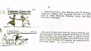 Clearly J E W Rolls was sitting on the jury during a very long day in 1849 and like most of us he was tempted to doodle. The end product is 6 pages of finely drawn cartoons illustrating the offences of each of the 60 prisoners in turn.