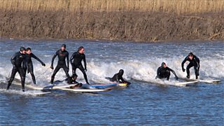 The river has various twists and turns where the water is compressed into narrow, shallower sections and produces a larger, better looking wave - favoured by surfers.