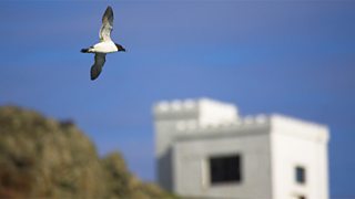 Razorbill soaring over Ellens Tower at South Stack. Image by Ben Hall/ rspb-images.com: