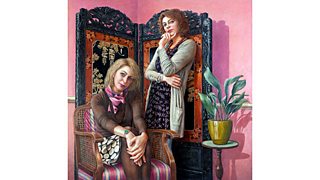 In most of her paintings, the observer is usually present and pictured but in Beneath Suspicion Sally removes that character from the painting, instead transferring that role to the viewer, so both women captured look out seductively.