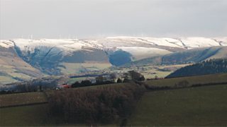 I took this photo today of a slight dusting of hail/sleet/snow on the wind farm above Llandinam. Image by Bill Pugh.