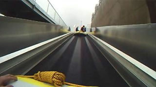 As we paddled around the edge of the complex towards the entrance, we were greeted by a rather strange site - an enormous escalator which wouldn't have looked out of place in a 'Bond' movie, stuck on the side of a villain's house with a crocodile pit at the bottom.