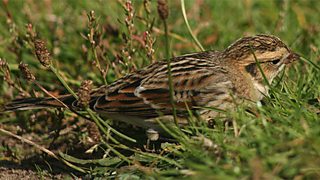"Slightly smaller than a reed bunting with a well marked head pattern, chestnut nape and chestnut wing panel. It spends most of its time on the ground and often seen in small flocks."
