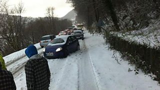 Hail bigger than peas was followed by snow and several inches fell in a couple of hours closing the road for a time and causing problems for motorists.
