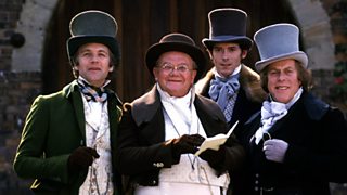 Jeremy Nicholas, Nigel Stock, Alan Parnaby and Clive Swift in the BBC's 1985 adaptation of Charles Dickens' novel The Pickwick Papers