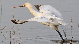 The spoonbill occurs in North East Africa, Europe, Asia and Japan and was snapped, dancing on water by Moses Davies: