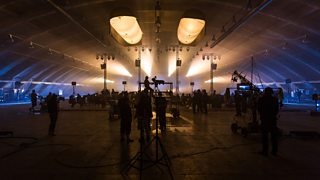 The first thing that struck me was how huge the space was! Dark, cavernous, and completely empty but for the orchestra and the lighting and camera rigs, the hangar made an impressive, blank stage upon which to create some magic with lights, a little bit of smoke, and (if you've now seen Ten Pieces you will also know) a lot of water.