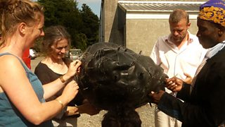 The piece used an enormous costume Jelili wore, crafted by the artists out of found materials and some of their own recycled sculptures.