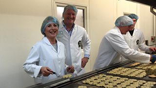 Sian Lloyd tosses Welsh cakes at a Wrexham bakery
