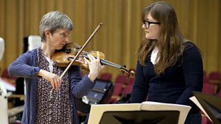 A composer from last year's project works with BBC NOW's leader, Lesley Hatfield