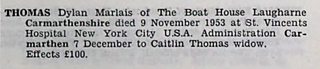 Copy of the online probate record relating to Dylan Thomas. Courtesy of ancestry.co.uk