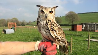 Eve, an owl used in National Theatre Wales' production of Raw Material: Llareggub Revisited.