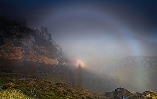 I recently witnessed a fog bow (the outer circle) a brocken spectre (my shadow in the light) and a glory (coloured ringed halo) - Alan C