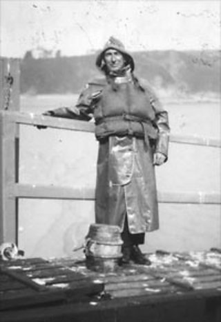 "At about 4.30 in the morning of January 15 1938 the coastguard at Tenby, Pembrokeshire, reported that a small steamer was in distress. She was the Fermanagh, of Belfast, bound light for Llanelly. A gale was blowing from the south west, with frequent gusts at hurricane force. At 5.15 the motor lifeboat John R. Webb was launched and found the Fermanagh had come off the rocks and was drifting before the gale, her stern sinking, her bows in the air. The lifeboat crew could see men aboard her. The second coxswain at once took the lifeboat alongside, handling her with great skill in the heavy seas. She was there only a few seconds. In that time the eight men of the Fermanagh's crew had jumped aboard her. The lifeboat made at once for Tenby, arriving at 8.30am. After landing the rescued men, she put out again to search for the master, but could find no trace of him. The weather was so bad that the lifeboat could not be rehoused until 4.15 in the afternoon" (Ref. Minutes of the Committee Meeting).