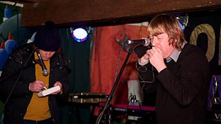 It's hugely disconcerting when the voice I introduce him with cedes into a vocal piece I recorded for his most recent album (Small Thoughts). The set then quietly delights us all. What wonderful spells Ashley casts with his slipstream voice, acoustic guitar, an iPod with a few backing tracks on it, and Y Niwl's Sîon Glyn on stylophone (on one song, anyway).