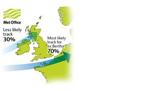 Possible route for the remains of tropical storm Bertha.