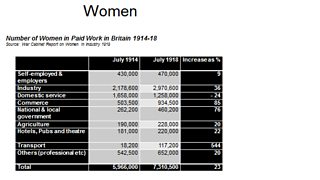 This is graphically illustrated here by the War Cabinet's own figures, which shows an overall increase of 23% in the employment of women – though with considerable variations in differing areas of employment such as transport and domestic service (the only area where there was a fall in women's employment).