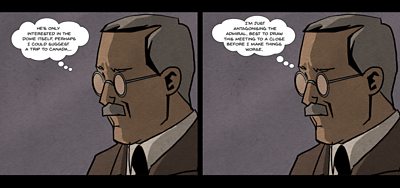 I wanted to signal a ‘change of gears’ after the completion of the meetings, where the consequences of the mission would be illustrated to the reader. So we returned to our idea of a limited amount of narration, as we imagined a retired Sir Henry, in his dotage perhaps, recalling how his mission had affected the conflict and the wider world after the war.