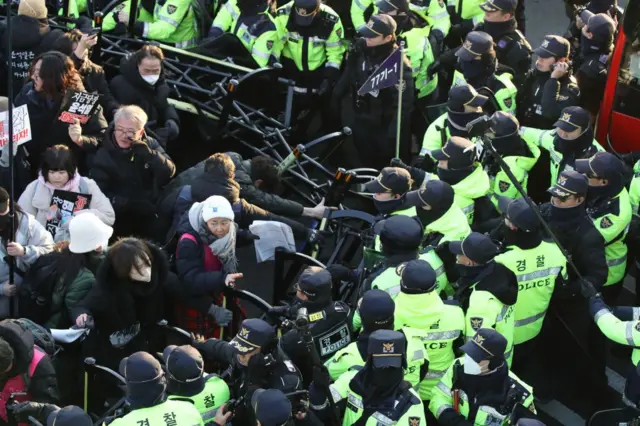 စစ်တပ်နဲ့ လုံခြုံရေး အရာရှိတွေဟာ လူသားတံတိုင်းတစ်ခု ဖွဲ့စည်းခဲ့သလို ကားတွေကိုသုံးပြီး ဖမ်းဆီးရေးအဖွဲ့ရဲ့ လမ်းကြောင်းကို ပိတ်ဆို့ထားခဲ့တယ်လို့ တောင်ကိုရီးယားသတင်းဌာန ယွန်ဟတ်ကနေ ဖော်ပြခဲ့ပါတယ်။