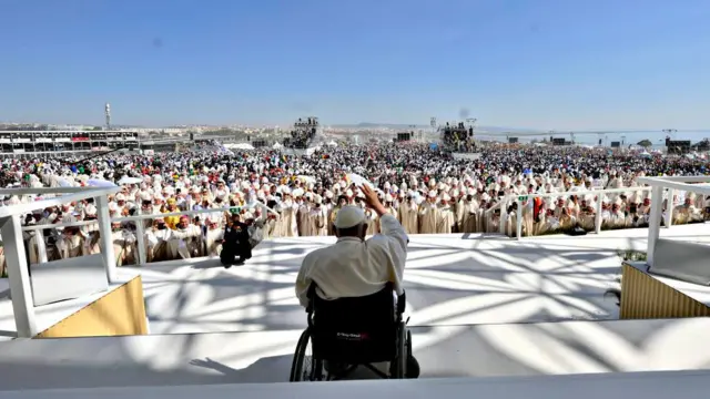 ပုပ်ရဟန်းမင်းကြီး ဖရန်စစ်ဟာ ပေါ်တူဂီနိုင်ငံမှာ ရောက်နေပြီး ဒီကနေ့ တနင်္ဂနွေနေ့ ဝတ်ပြုဆုတောင်းပွဲကို လူသန်းနဲ့ချီ ကြီးမားများပြားလှတဲ့ လူအုပ်ကြီးရဲ့ ရှေ့မှောက် ပြုလုပ် ခဲ့ပါတယ်။
