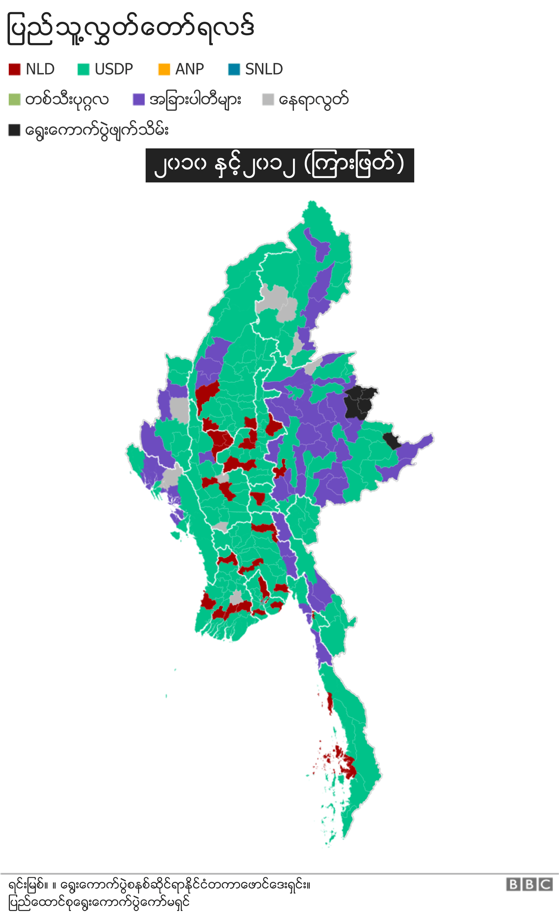 ဒီနေရာမှာ ၂၀၀၈ အခြေခံဥပဒေရဲ့ ပြဌာန်းချက်အရ လွှတ်တော် နှစ်ရပ်ပေါင်း ကိုယ်စားလှယ် ၆၆၄မှာ တပ်မတော် က တိုက်ရိုက်ခန့်ကိုယ်စားလှယ် ၁၆၆ ဦးက တိုက်ရိုက် ဝင်နေတာ ဖြစ်ပါတယ်။ ဒီတော့တကယ်တမ်း ရွေးကောက်ပွဲမှာ ပြိုင်ရမယ့်နေရာက တိုက်ရိုက်ခန့်ကိုယ်စားလှယ် ၁၆၆ ဦးကို နုတ်ရင် ပြည်သူလွှတ်တော် အမျိုးသားလွှတ်တော် နှစ်ရပ်ပေါင်းမှာ ၄၉၈ နေရာပဲ ရှိပါတယ်။နယ်မြေလုံခြုံရေးအရ ရွေးကောက်ပွဲ မလုပ်နိုင်တဲ့ နယ်မြတွေရှိရင်တော့ ဒီထက်ပိုပြီးနည်းနိုင်ပါတယ်။ ပြီးခဲ့တဲ့ ၂၀၁၅ ရွေးကောက်ပွဲတုန်းကတော့ အမျိုးသားဒီမို ကရေစီ အဖွဲ့ချုပ်ဟာ လွှတ်တော် နှစ်ရပ် ပေါင်းကိုယ်စားလှယ်နေရာ ၃၉၀ အနိုင်ရခဲ့ပြီး ၂၀၁၀ တုန်းကတော့ ပြည်ထောင်စု ကြံ့ခိုင်ရေးနဲ့ဖွံဖြိုးရေးပါတီက ၃၈၈နေရာ အနိုင် ရရှိခဲ့ပါတယ် ။