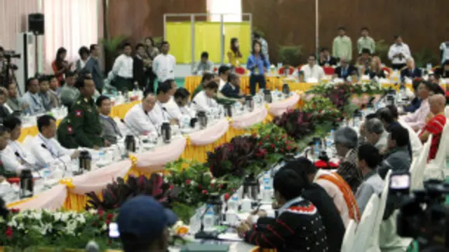 ကချင်ပြည်နယ် မြစ်ကြီးနားမြို့မှာ တိုင်းရင်းသား လက်နက်ကိုင် အဖွဲ့ ၁၆ ဖွဲ့နဲ့ မြန်မာအစိုးရ ငြိမ်းချမ်းရေး ဖော် ဆောင်ရေး အဖွဲ့တို့ကြား နှစ်ရက်ကြာ ဆွေးနွေးခဲ့ပြီးတဲ့နောက် နိုင်ငံရေး သဘောတူညီချက်တွေ ရအောင် ဆက်လက် ဆောင်ရွက်ကြမယ့် အစီအစဉ် သုံးချက်ကို သဘောတူညီကြောင်း ပူးတွဲ ကြေညာချက် ထုတ်ပြန်လိုက်ပါတယ်။