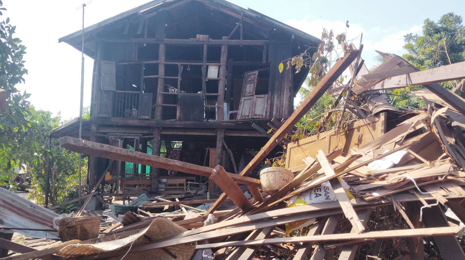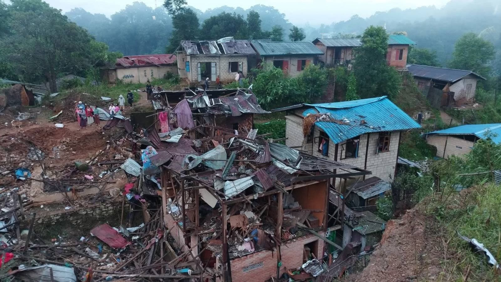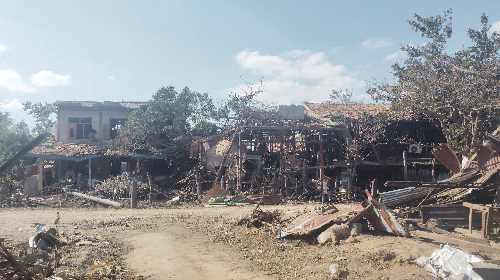 ဩဂုတ် ၁၄ က မိုးကုတ်မြို့နယ်ကို စစ်တပ်ရဲ့ လေကြောင်းတိုက်ခိုက်ခဲ့မှုကြောင့် ပျက်စီးသွားတဲ့ နေအိမ်တွေ