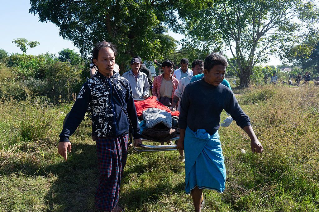 စစ်ကိုင်းတိုင်း၊ ဒီပဲယင်းမြို့နယ်မှာ စစ်တပ်လေကြောင်းတိုက်ခိုက်မှုကြောင့် သေဆုံးခဲ့သူတွေ ရဲ့ ရုပ်အလောင်းတွေကို ဒေသခံတွေ သယ်ယူခဲ့တာပါ။ (ပုံဟောင်း)