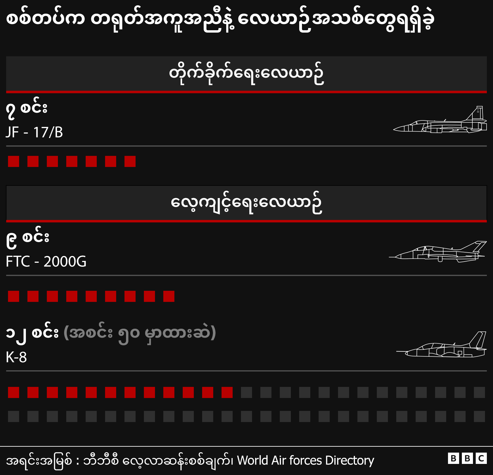 ၂၀၂၁ ခုနှစ်၊ ဖေဖော်ဝါရီလ စစ်အာဏာသိမ်းမှုဖြစ်ပြီးကတည်းကဆိုရင် စစ်တပ်ဟာ တရုတ်နဲ့ ရုရှားဆီကနေ စစ်သုံးလက်နက်တွေ ဆက်ပြီးရရှိနေပါတယ်။ အဲဒီထဲမှာ JF-17/B တိုက်လေယာဥ် ၇ စင်း၊ လေကြောင်းတိုက်ခိုက်မှုအတွက်ပါ အသုံးပြုနိုင်တဲ့ FTC-2000 လေ့ကျင့်ရေးလေယာဥ် ၉ စင်းအထိ တရုတ်ဆီက ရရှိထားပါတယ်။