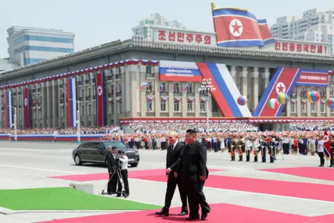 ဓာတ်ပုံ ပုံစာ, ကော်ဇောနီထက်လျှောက်လှမ်းနေတဲ့ သမ္မတပူတင်နဲ့ မြောက်ကိုရီးယားခေါင်းဆောင် ကင်ဂျုံအွန်း RT ကတော့ ‘‘ရင်ပြင်ဟာ သမ္မတပူတင်ကို နှုတ်ဆက်ဖို့လာရောက်တဲ့ဒေသခံတွေနဲ့ပြည့်နေခဲ့တယ်’’ လို့ပြောပါတယ်။