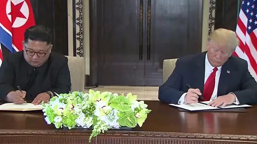 စင်္ကာပူနိုင်ငံမှာ သမ္မတ ထရမ့်နဲ့ ကင်ဂျုန်းအွန်တို့ တွေ့ဆုံဆွေးနွေးခဲ့အပြီး လက်မှတ်ရေးထိုးခဲ့တဲ့ သဘောတူချက်ထဲမှာတော့ ဒီကတိပြုချက် မပါဝင်ပါဘူး။
