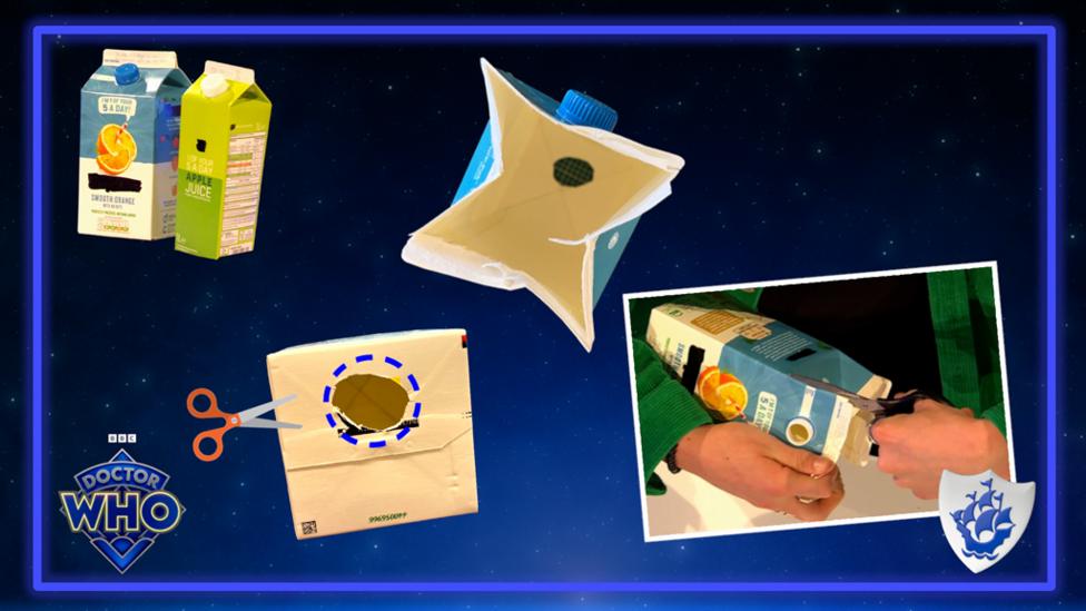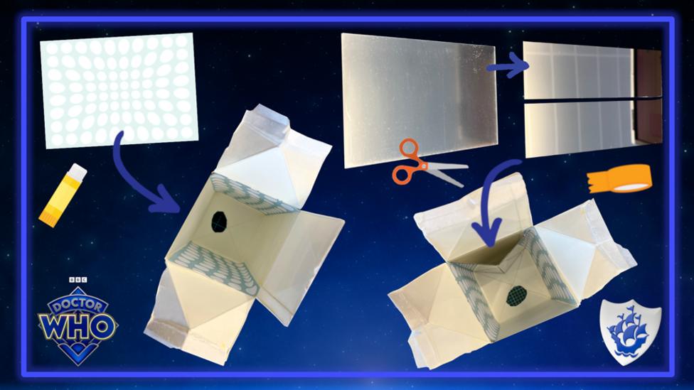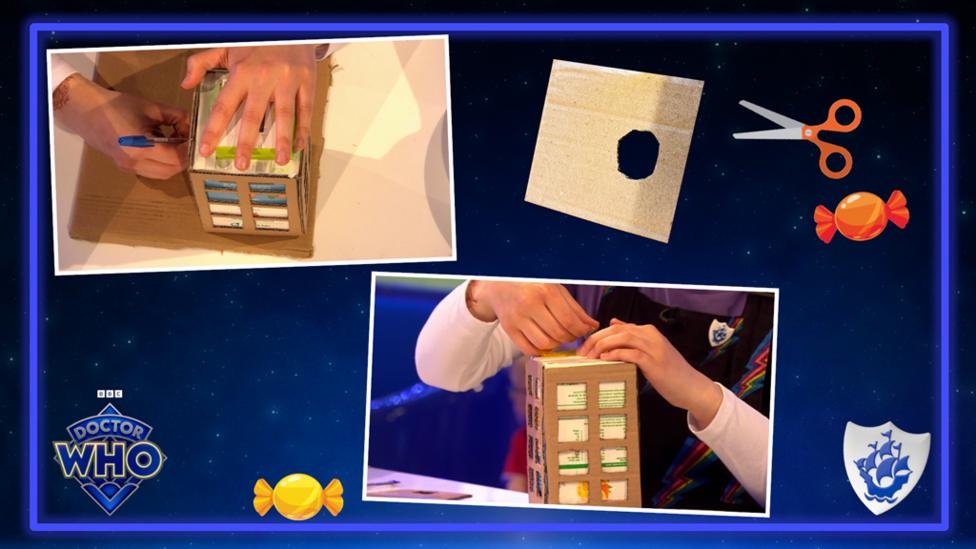 To make sure your TARDIS can travel through time, why not make a convincing console for the middle. You can get really creative with recycling here! We cut the top off a water bottle (you’ll need a grown-up to help with this part) and placed a small plastic sweets tube inside the neck of the bottle, sticking with clear tape. We also added a spiralled silver pipe cleaner, which we think looks awesome. You could use any recycled small bottle to create this effect too, we found a bubble bottle works really well or an empty spice jar.