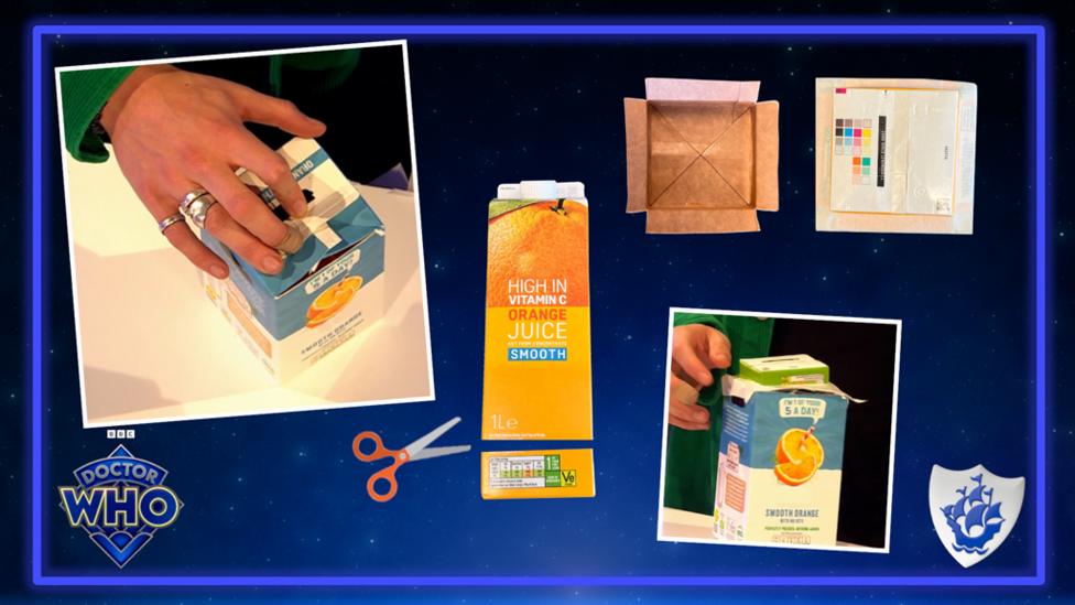 Open up the cardboard top of the carton, using the tabs. Carefully cut down each edge and fold down the flaps. Cut off the front flap (that's the part that had the spout and lid on it).