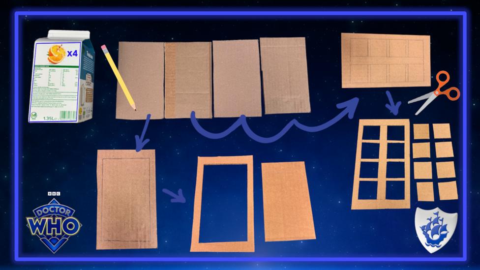 To make the outer panels of the TARDIS use your large carton as a template and trace around it onto your recycled cardboard four times.