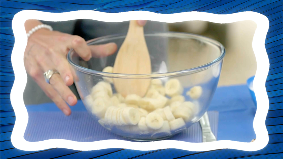 First chop up you ripe bananas into slices. (Be careful using sharp objects, get a grown up to help you)