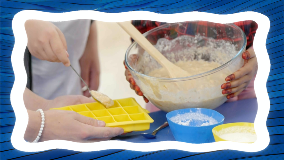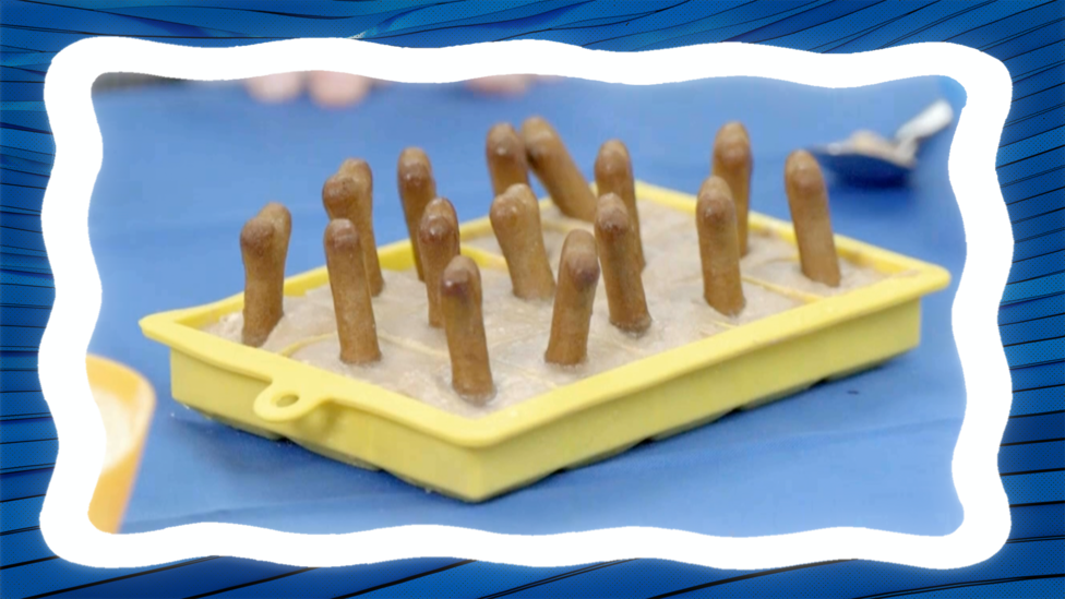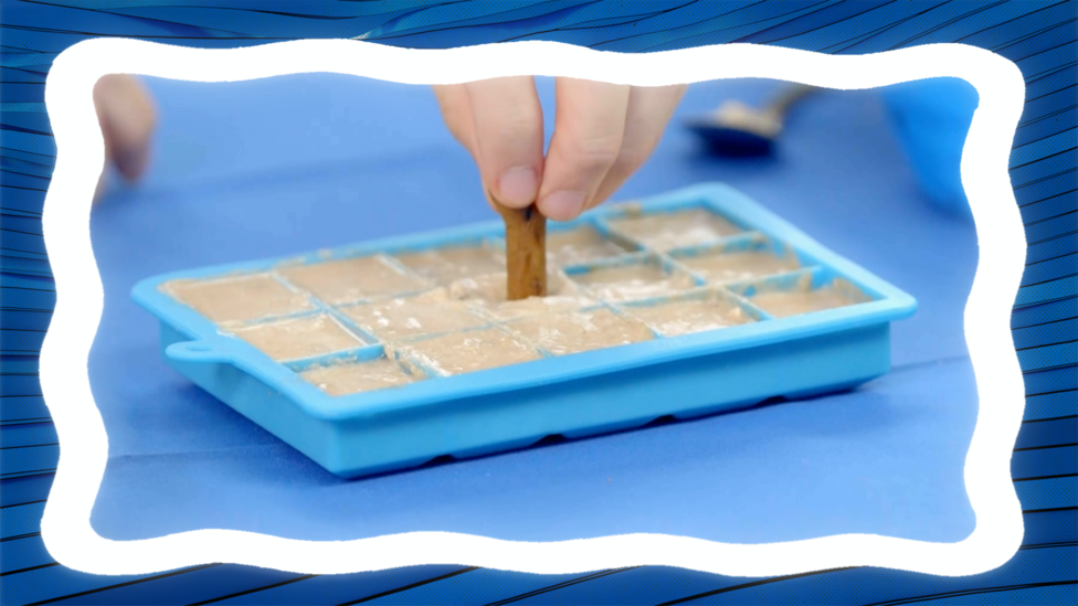 Take the mixture out of the freezer and place a dog biscuit into each cube to act as a lolly stick. Make sure the biscuit is pushed into the middle to keep it secure.