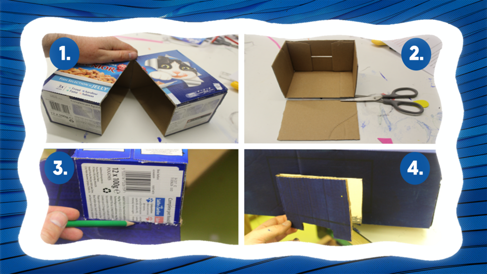 First, cut the small cardboard box in half using your scissors. This may be difficult so get a grown-up to help you!