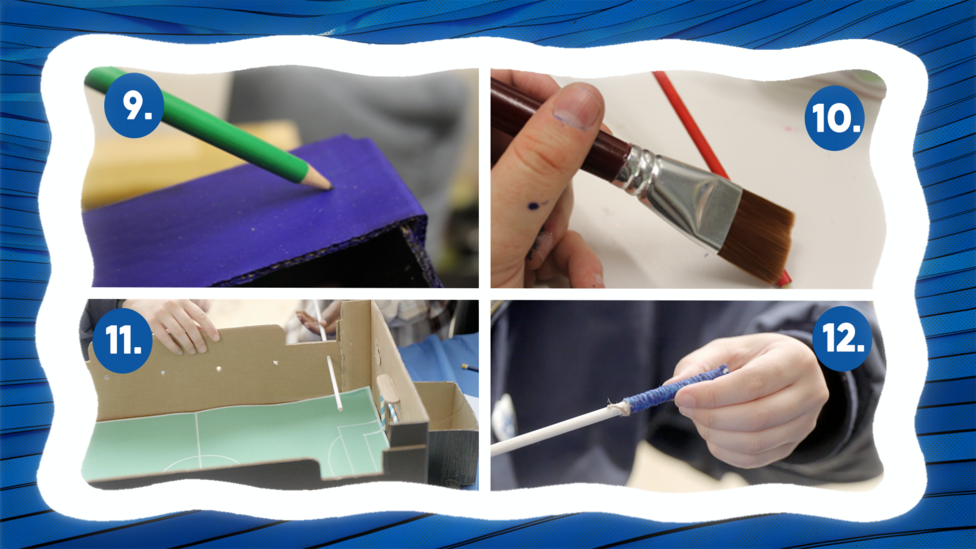To create the football pitch, use a large piece of paper (green if you have it) and draw football markings on it. Stick the paper onto the bottom of your large box and you have just made your pitch.