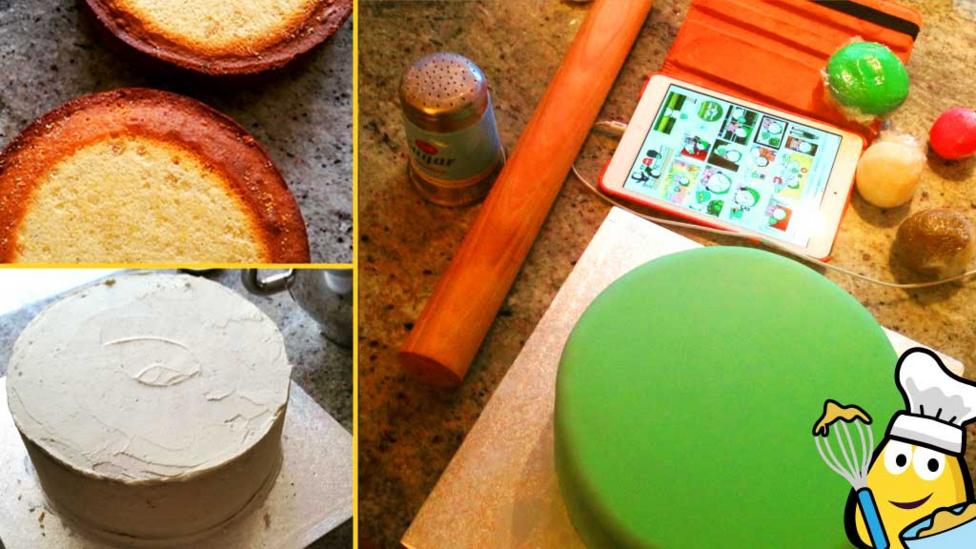 Using a small amount of green gel food colouring, colour 1kg of fondant to cover the cake. Roll this out to a circle of about 40cm diameter and use your rolling pin to carefully lift this onto the cake. Use a cake smoother (or your hands) to smooth the fondant onto and all around the cake. Cut the excess fondant from the base of the cake with a sharp knife.