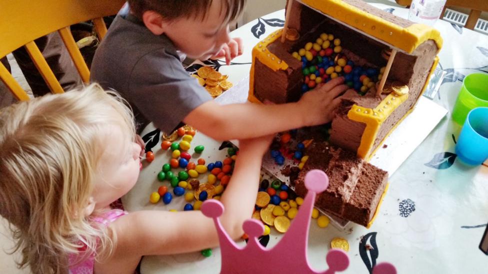 Present the cake to some very excited and grateful children, who will go mad for the sweets tumbling out of the middle of the cake when it’s cut into, as my nephew and niece did in the picture below