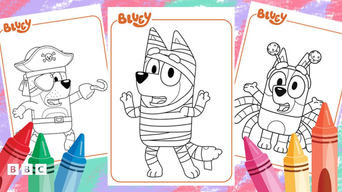 Download and print out Bluey Halloween colouring sheets. With a choice of Bluey, Bingo and Bandit in their Halloween fancy dress costumes and some spooky scenes showing their decorated family house. Once you've coloured them in, you can use the sheets at home and in the classroom as Halloween decorations.