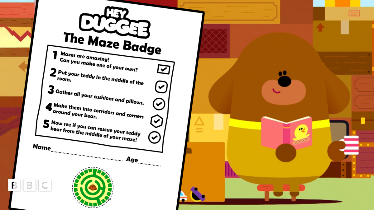 Hey Duggee: Maze Badge Activity Sheet Print out the activity sheet to earn yourself a Hey Duggee Maze Badge!Get this activityRelated topicsHey Duggee