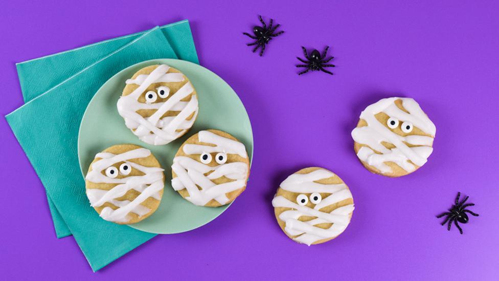 Spoon the icing into a disposable piping bag, then snip off the end and pipe zig-zags of lines across the cookies to make mummy ‘bandages’, leaving a small gap near the top of the cookie for the eyes.