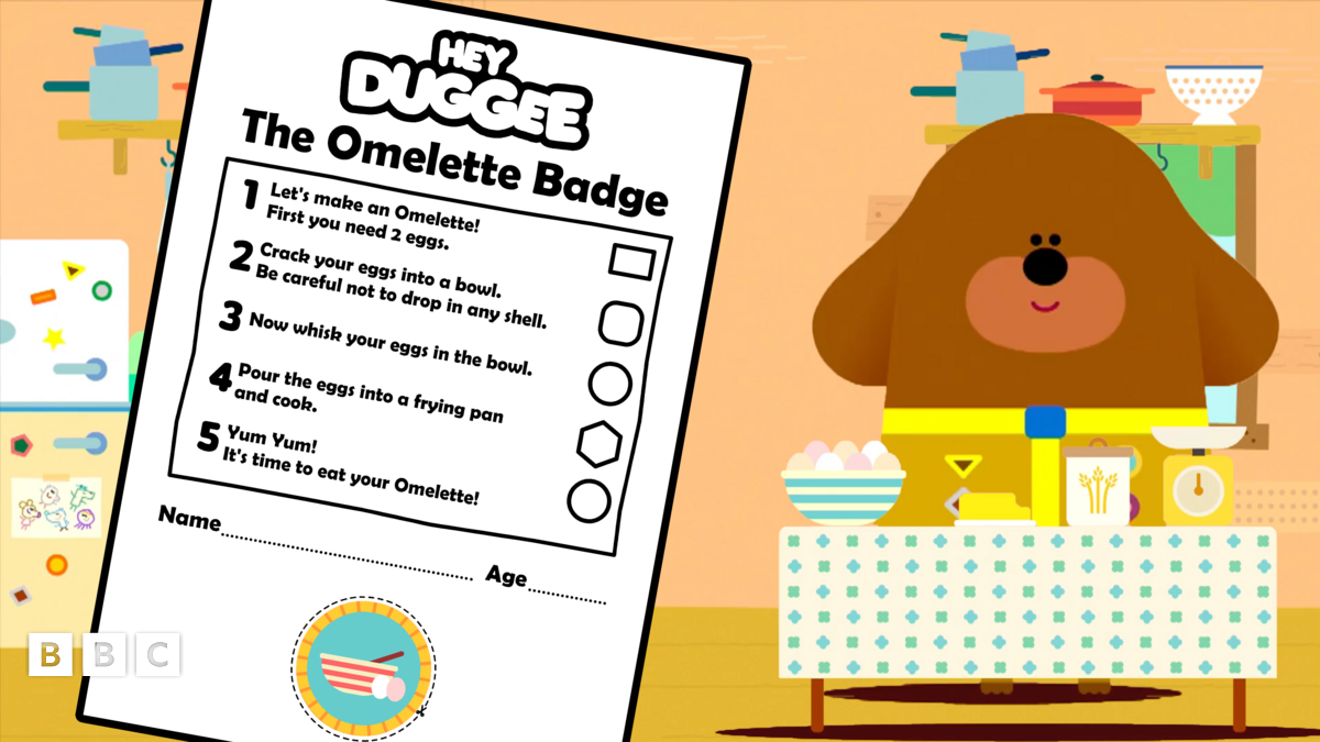 Print out this epic Hey Duggee activity sheet, follow the steps and earn an Omelette Badge.